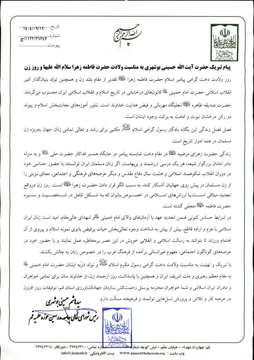 به گزارش روابط عمومی سازمان جهاد کشاورزی استان قم،حضرت آیتالله سیدهاشم حسینی بوشهری، رئیس جامعه مدرسین حوزه علمیه قم، همزمان با فرارسیدن سالروز میلاد حضرت فاطمه زهرا(س) و گرامیداشت روز زن، در پیامی این مناسبت را به زنان ایران اسلامی تبریک گفت. وی در پیام خود با اشاره به جایگاه والای حضرت زهرا(س) در تاریخ اسلام و نقش بیبدیل ایشان در تبیین ارزشهای الهی، تأکید کرد: سیره حضرت زهرا(س) الگویی تمامعیار برای زنان مسلمان در عرصههای فردی، خانوادگی و اجتماعی است. رئیس جامعه مدرسین با بیان اینکه زنان ایرانی در دوران انقلاب و دفاع مقدس نقشآفرینیهای ماندگاری از خود بهجا گذاشتهاند، افزود: امروز نیز بانوان کشور با الهام از سبک زندگی حضرت زهرا(س) در حوزههای علمی، فرهنگی و اجتماعی حضوری فعال و موثر دارند.